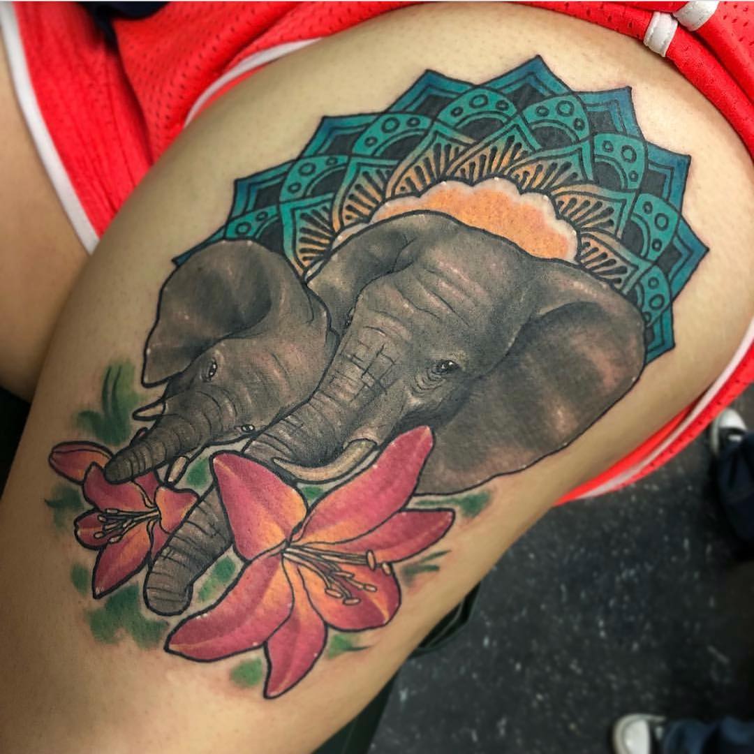 昆明的李先生,他的大腿上的纹身竟然是一头大象,但是你会发现,这头大象格外的吸引人,而且当我们仔细一看的时候,发现不止有一头大象,而是两头大象,它们的鼻子上面分别卷着百合花。
